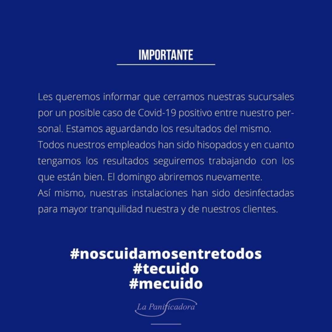 “Les queremos informar que cerramos nuestras sucursales por un posible caso de Covid-19 positivo entre nuestro personal. Estamos aguardando los resultados del mismo”, anunciaron en un comunicado que compartieron en Facebook.