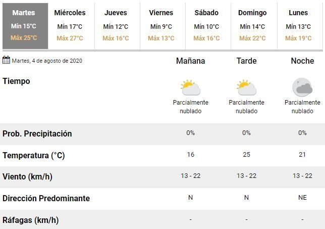 En el Servicio Meteorológico Nacional (SMN) hicieron un pronóstico que va en la misma línea que la de sus colegas locales. De acuerdo con el organismo se espera un martes "parcialmente nublado", con una mínima de 15°C y una máxima que rondaría los 25°C.
