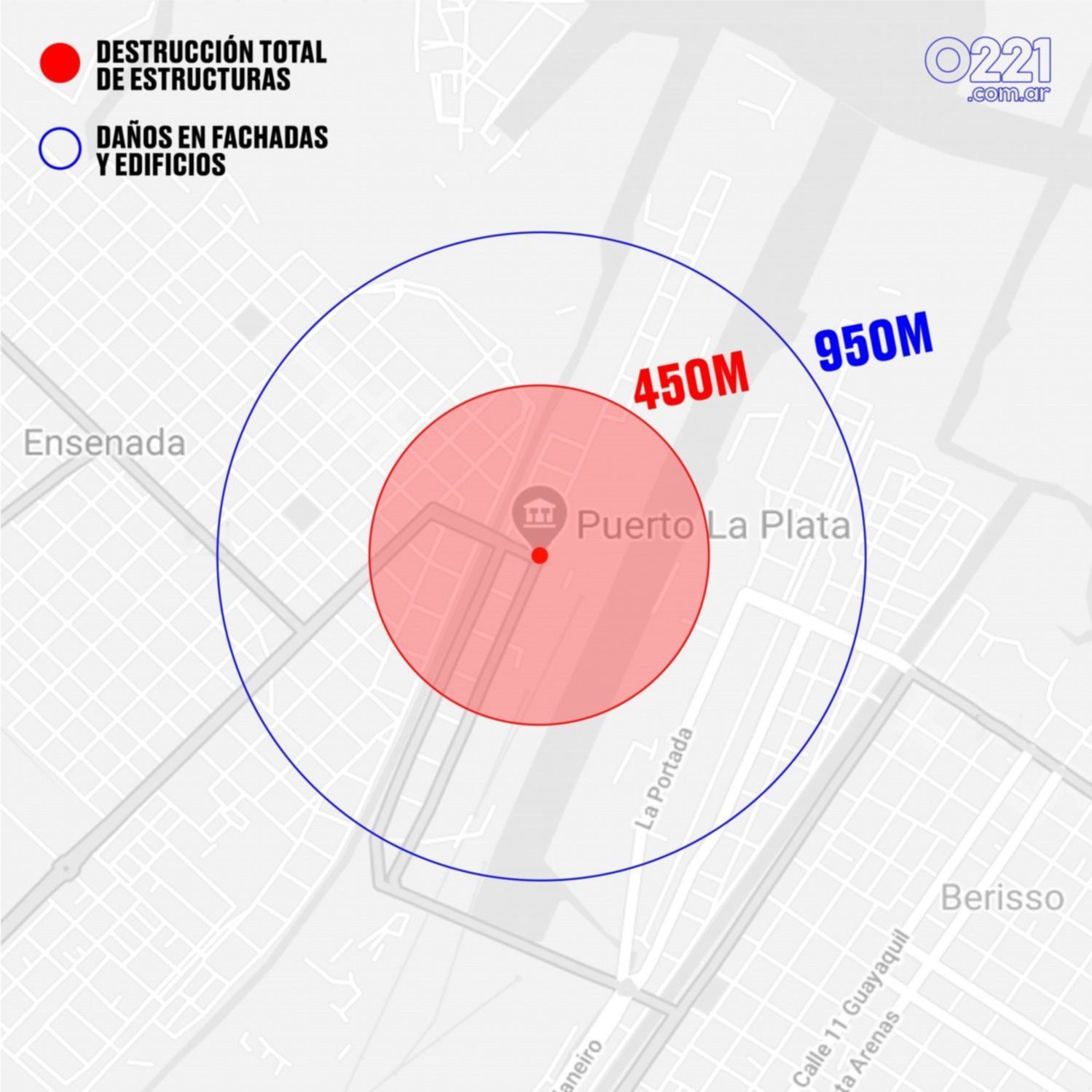 Si una explosión idéntica ocurriera en el Puerto de La Plata, ubicado en el límite de Berisso y Ensenada, esas secuelas se sentirían en casi la totalidad del casco urbano de La Plata: llegarían, por ejemplo, a la plaza 19 de Noviembre (25 y 44), el Parque San Martín y la zona del Estadio Ciudad de La Plata.