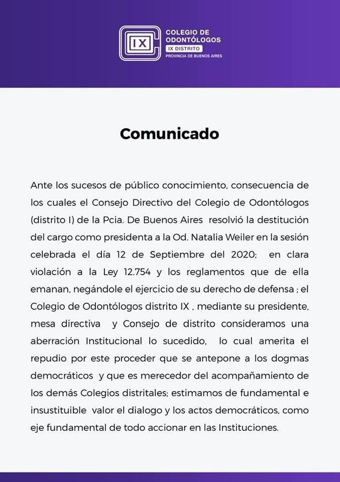 Tras haber enviado una carta formal al Consejo Superior de Odontólogos de la provincia de Buenos Aires, Natalia Weiler expone las irregularidades que tuvo su separación del cargo y pide al menos la posibilidad de explicar y defenderse de las acusaciones realizadas por el organismo platense para impulsar su salida. “A mi me juzgaron, sancionaron y sentenciaron las mismas personas. No me dieron derecho a réplica y me sacaron del medio. Es un bochorno para una institución seria como la nuestra”, sostuvo la profesional afectada.