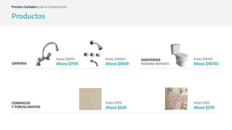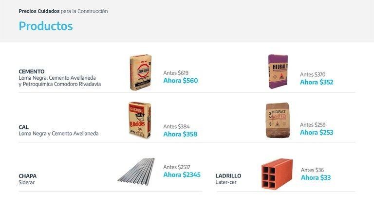 En cuanto a los precios, una bolsa de cemento (Loma Negra) se consigue a $560 (antes $619); una bolsa de cal, a $358 (antes a $384); chapa (Siderar), a $2.345 (antres $2.517); ladrillos, a $33 (antes a $36); placa de cemento, a $1.135 (antes de $1.195); grifería por $ 7.515 (antes a $8.299); inodoros a $16.702 (antes $19.499), entre otros productos. La lista completa se puede consultar en la página www.argentina.gob.ar/precios-cuidados/construccion.