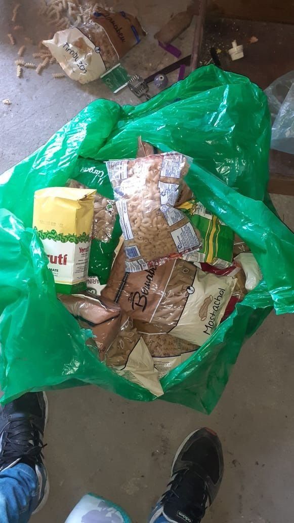 Las autoridades secuestraron una pava, una olla, paquetes de fideos, de arroz, de lentejas, de harina, cajas de leche en polvo, una jarra, una espátula, un pisa papas, un cucharón, cucharas y demás utensilios.