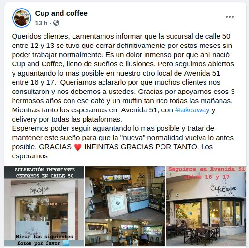 “Queridos clientes, lamentamos informar que la sucursal de calle 50 entre 12 y 13 se tuvo que cerrar definitivamente por estos meses sin poder trabajar normalmente. Es un dolor inmenso por que ahí nació Cup and Coffee, lleno de sueños e ilusiones”, contaron a sus clientes en sus posteos tanto en Facebook como en Instagram.