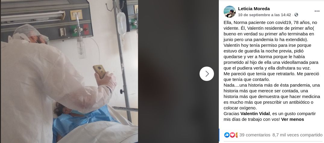 "Ella, Norma paciente con Covid-19, 78 años, no vidente. Él, Valentín residente de primer año (bueno, en verdad su primer año terminaba en junio pero la pandemia lo ha extendido). Valentín hoy tenía permiso para irse porque estuvo de guardia la noche previa, pidió quedarse y ver a Norma porque le había prometido al hijo de ella una videollamada para que él pudiera verla y ella disfrutara su voz”. Esas fueron las palabras de Leticia Moreda, su compañera en el servicio de Clínica Médica del hospital.