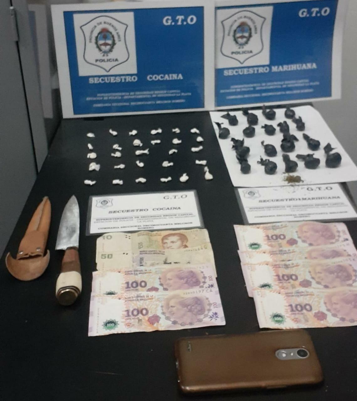 Además de las drogas, los oficiales encontraron un teléfono celular y el total de 665 pesos. "Debajo del asiento del conductor encontramos varios envoltorios de nylon de color negro que contenían marihuana y otros envoltorios de color blanco, los cuales parecían contener cocaína", informó uno de los efectivos que participó del hecho.