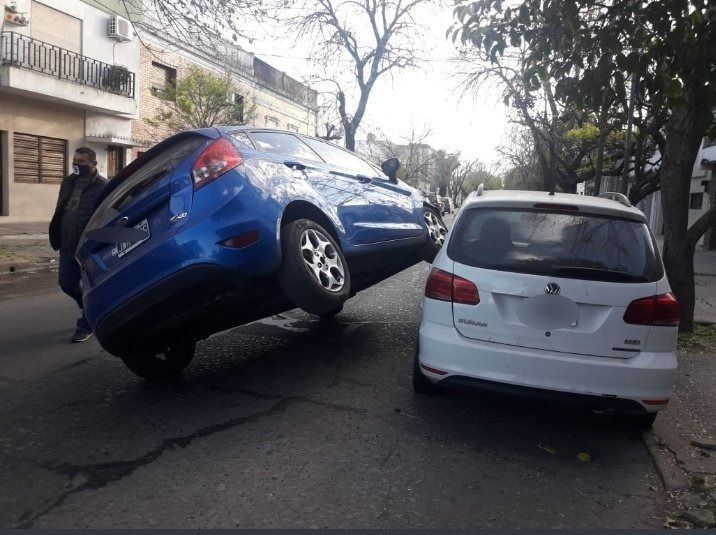 En la imagen se puede observar cómo el auto azul terminó sobre dos ruedas, mientras que la delantera se apoya sobre el Volkswagen Suran que estaba estacionado.