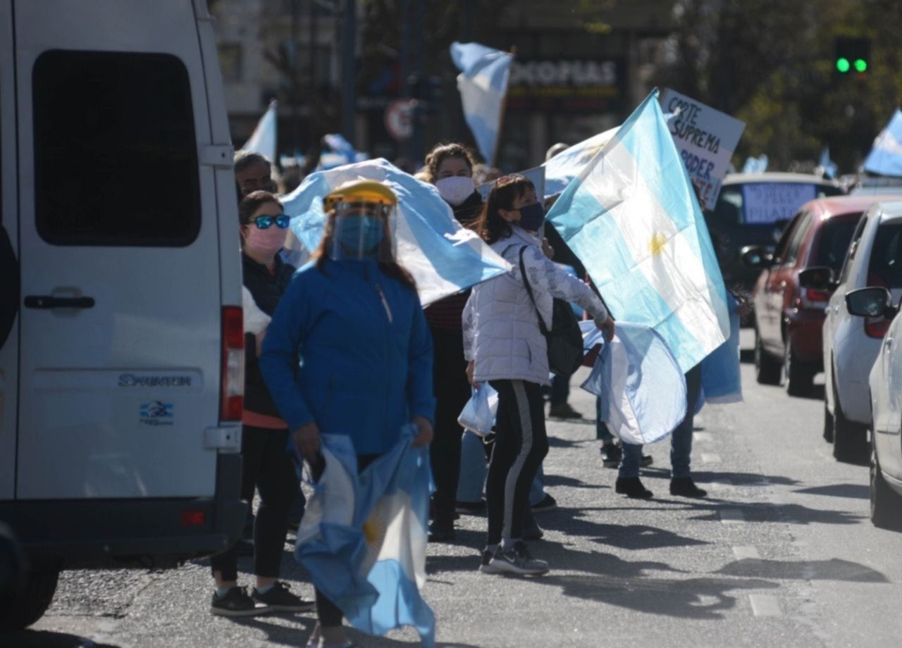 Con pancartas, banderas y bocinazos desde los autos, un grupo de platenses mostraron su disconformidad con la gestión de Alberto Fernández, reuniéndose sobre calle 12 en Plaza Moreno.