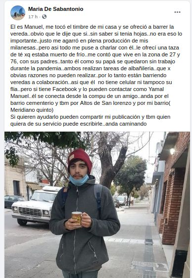 Manuel ni nadie de su núcleo familiar cuenta con un teléfono celular, pero sí tiene Facebook. Quienes quieran ayudarlo pueden contactarlo en el perfil Yamal Manuel. “Él se conecta desde la compu de un amigo. Anda por el barrio Cementerio y también por Altos de San Lorenzo y por mi barrio ( Meridiano Quinto)”, agregó María, quien ahora busca ubicarlo debido a los ofrecimientos de trabajo que recibió para el chico.