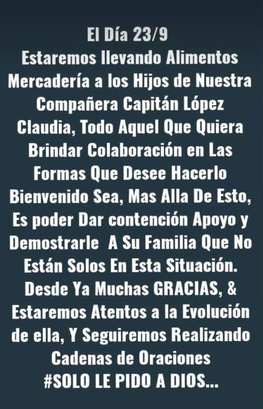 “El día 23/9 estaremos llevando alimentos, mercadería a los hijos de nuestra compañera capitán López Claudia. Todo aquel que quiera brindar colaboración en las formas que desee hacerlo bienvenido sea”, comunicaron por Facebook.
