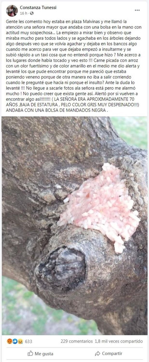 La grave denuncia de una mujer en un grupo de mascotas encendió las alarmas de quienes frecuentan la zona de plaza Malvinas. Según su relato, una señora mayor colocó estratégicamente carne picada con arroz y veneno para matar aquellos animales que se acerquen a los árboles.