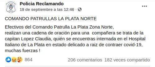 “Lamento comunicar a los camaradas el fallecimiento de quien fuera en vida la Capitán Claudia Alejandra López este día lunes 21 de septiembre. Gran compañera... 31 años de servicio, la cual se encontraba prestando servicio en el Comando de Patrullas Norte (Villa Elisa). A raíz de haberse contagiado del virus COVID-19, la peleó hasta el final como lo hizo a lo largo de su carrera”, expresó un excompañero en un posteo en las redes sociales.