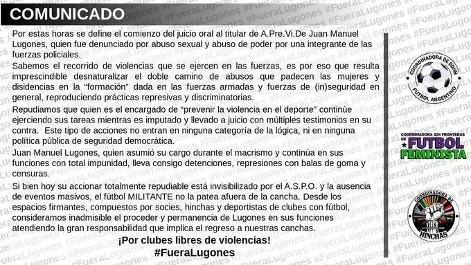 “Por estas horas se define el comienzo del juicio oral al titular de Aprevide Juan Manuel Lugones, quien fue denunciado por abuso sexual y abuso de poder por una integrante de las fuerzas policiales”, comienza el documento firmado por la Coordinadora de Hinchas, la Coordinadora DDHH del Fútbol y la Coordinadora Sin Fronteras de Fútbol Feminista.
