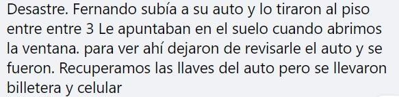 "Lo tiraron al piso entre tres y le apuntaron estando en el suelo. Cuando abrimos la ventana para ver, ahí dejaron de revisar el vehículo y se fueron. Si bien recuperó las llaves, se llevaron su billetera y el celular", indicaron en la publicación.