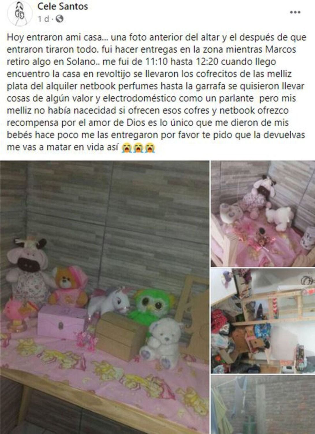 Lo único que le quedó a Celeste, la mamá de las nenas, fue una ecografía 3D de cuando aún estaban en su vientre. “Se llevaron los cofrecitos de las mellizas, plata del alquiler, netbook, perfumes y hasta la garrafa… Pero mis mellis… No había necesidad”, escribió en Facebook la mujer, expresando su bronca, pero sobre todo el dolor y desesperación, tras el trágico suceso.