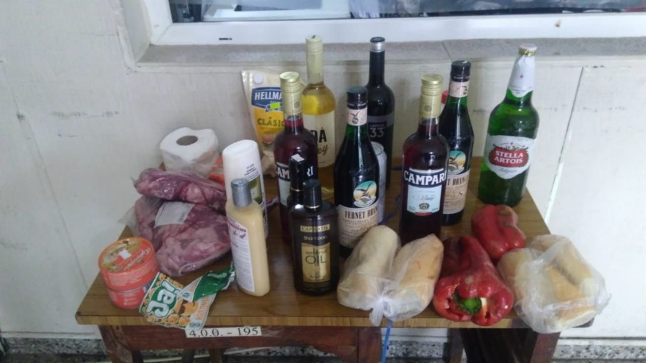 De acuerdo a los voceros, el ladrón se paseó por las góndolas para apoderarse de dos botellas de fernet Branca, dos Campari, una de vino tinto, otra de vino blanco, una botella de cerveza Stella Artois, dos envases de champú, un paquete de mayonesa, dos latas de atún, dos jugos en sobre, una botella de salsa de soja, dos morrones, una bolsa de pan y dos paquetes de carne cerradas al vacío.