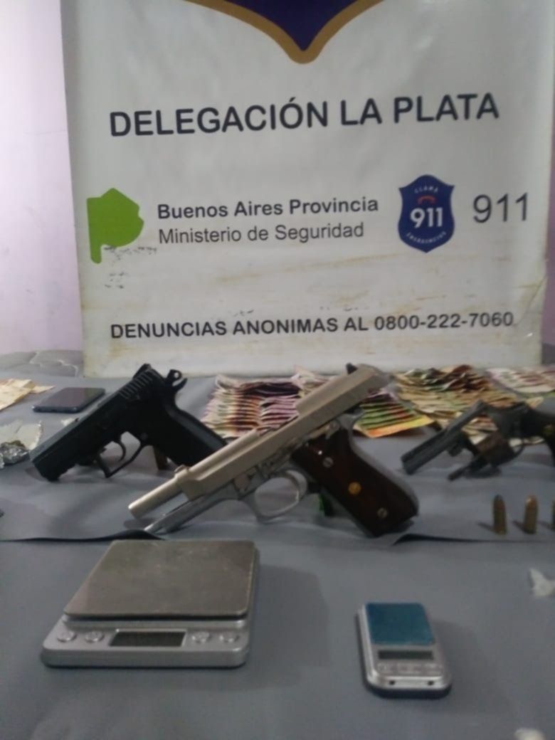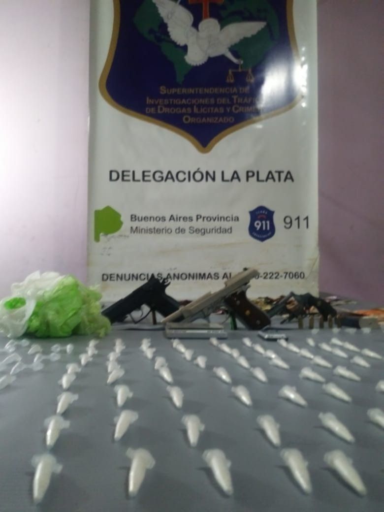 Una vez con la orden de registro necesaria, se allanó la propiedad donde se secuestró un envoltorio metalizado con 18 gramos de marihuana, un recipiente de plástico con 35 gramos de la misma sustancia en su interior, un paquete con 150 gramos de cocaína, 76 tubos de plástico con 145 gramos de la misma sustancia, dos celulares, 40.230 pesos, dos balanzas, dos pistolas y un revólver calibre 9 milímetros, proyectiles, recortes de nylon y una bolsa con 1.003 tubos plásticos pequeños, en su mayoría con estupefacientes preparados para su comercialización.
