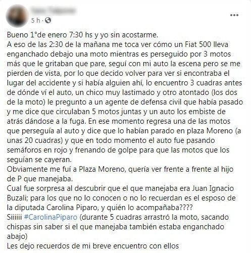 El violento inicio de año que sufrieron la diputada provincial y funcionaria municipal Carolina Piparo y su marido Juan Ignacio Buzzali sumó un nuevo capítulo a partir de la fuerte denuncia de una mujer que reveló que la pareja siguió a los ladrones y cuando lo hacía chocó a dos motociclistas de los que se desconoce si estaban o no involucrados en el robo. De acuerdo con su testimonio, el matrimonio arrastró durante varias cuadras la moto, sin siquiera detenerse a ver si sus ocupantes estaban bien o no.
