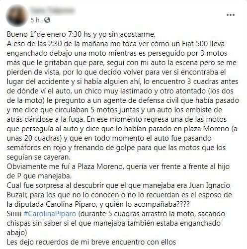 Después del robo del cual fueron víctimas y de la persecución y choque con uno de los presuntos ladrones, la diputada bonaerense Carolina Piparo y su marido Ignacio Buzzali fueron duramente increpados por una mujer que fue testigo de una parte de la secuencia que terminó con uno de los motoqueros lesionados tras el impacto.