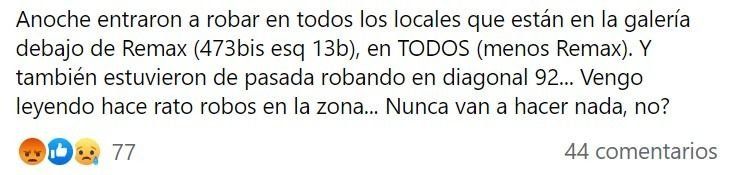 Sin ir más lejos, indicaron que el pasado fin de semana un grupo de delincuentes atacó en casi todos los locales de una galería ubicada en 473 bis y 13 b: "También estuvieron de pasada robando en diagonal 92. Nunca van a hacer nada, ¿no?", aseguraron.