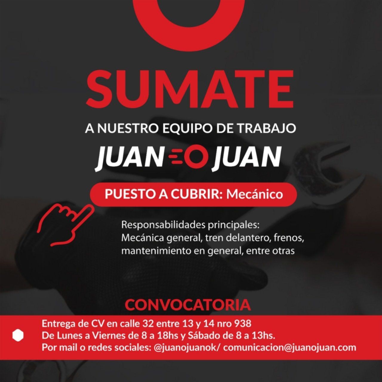 La entrega de CVs será en la sede del lugar, en calle 32 Nº 938 entre 13 y 14, de lunes a viernes de 8 a 18 y sábado de 8 a 13.. También se podrá enviar por mail o redes sociales: @juanojuanok/ [email protected].