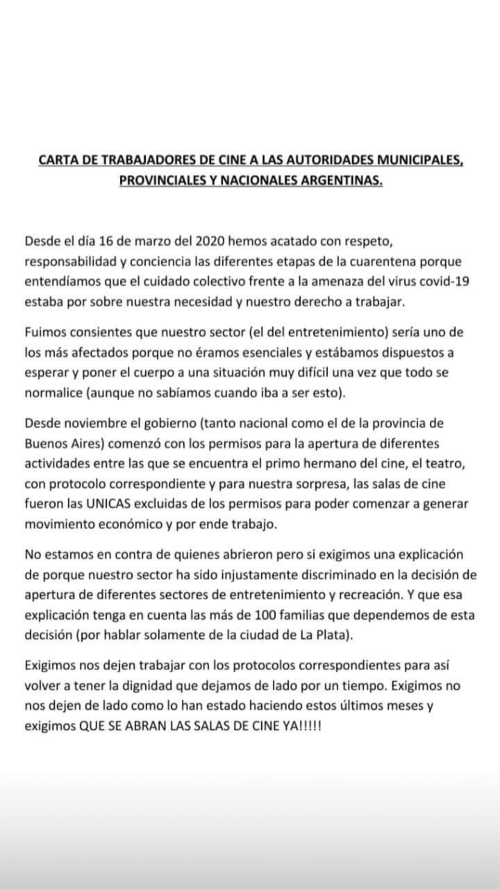 En el mismo tono, concluyeron: “Exigimos nos dejen trabajar con los protocolos correspondientes para así volver a tener la dignidad que dejamos de lado por un tiempo. Exigimos no nos dejen de lado como lo han estado haciendo estos últimos meses y exigimos ¡que se abran las salas de cine ya!”.