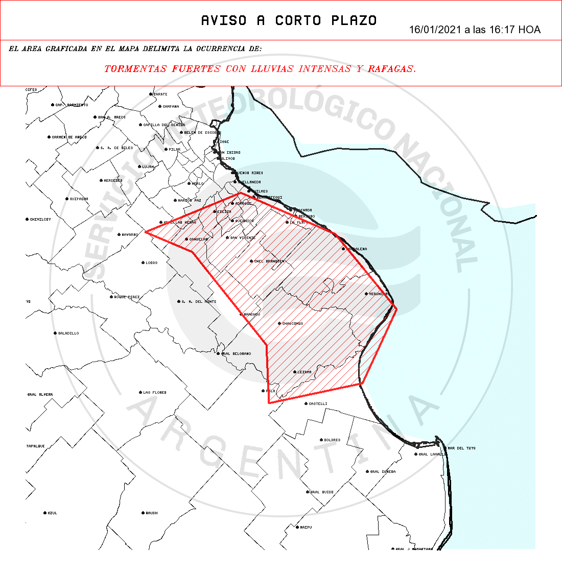 Los especialistas indicaron que, así como a la ciudad, el área de cobertura del alerta emitido hace instantes también incluye a las ciudades de Almirante Brown, Brandsen, Castelli, Cañuelas, Chascomús, Ensenada, Esteban Echeverría, Ezeiza, Florencio Varela, General Belgrano, General Las Heras, General Paz, La Matanza, Lezama, Lomas de Zamora, Magdalena, Marcos Paz, Pila, Presidente Perón, Punta Indio, Quilmes y San Vicente.