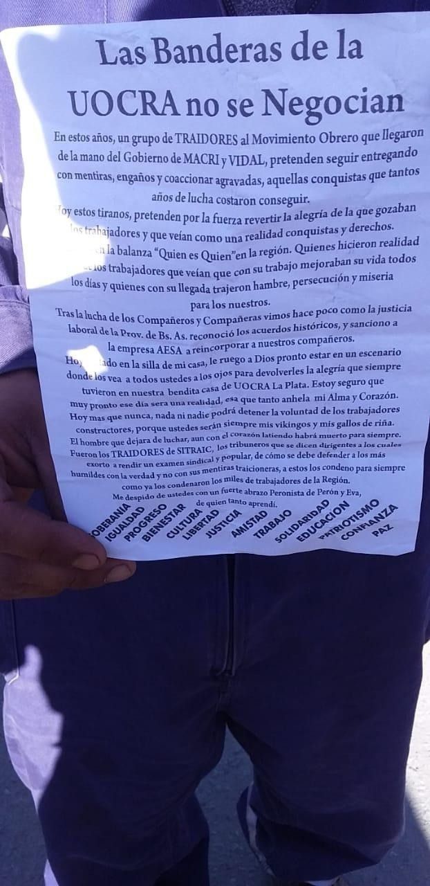 Fueron los traidores de SITRAIC los tribuneros que se dicen dirigentes, a los cuales fueron exhorto a rendir un examen sindical y popular de cómo se debe defender a los más humildes con la verdad y no con sus mentiras traicioneras. A estos los condeno para siempre como ya los condenaron los miles de trabajadores de la región. Me despido de ustedes con un fuerte abrazo peronista de Perón y Eva, de quienes tanto aprendí.