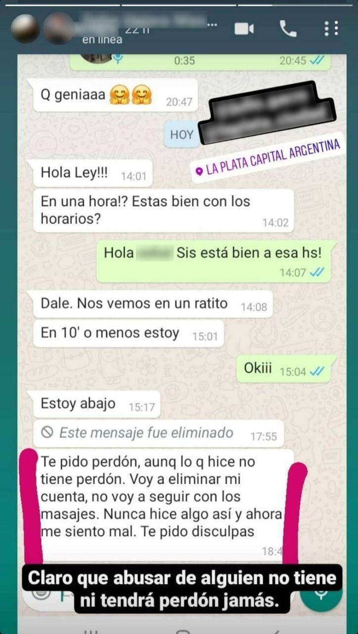 Según consta en la denuncia, el masajista "realizó tocamientos en las partes íntimas" de la víctima y tras reconocer los hechos le pidió disculpas a través de un mensaje de WhatsApp. "Te pido perdón, aunque lo que hice no tiene perdón. Voy a eliminar mi cuenta, no voy a seguir con los masajes. Nunca hice algo así y ahora me siento mal. Te pido disculpas", fueron las palabras que utilizó el acusado.