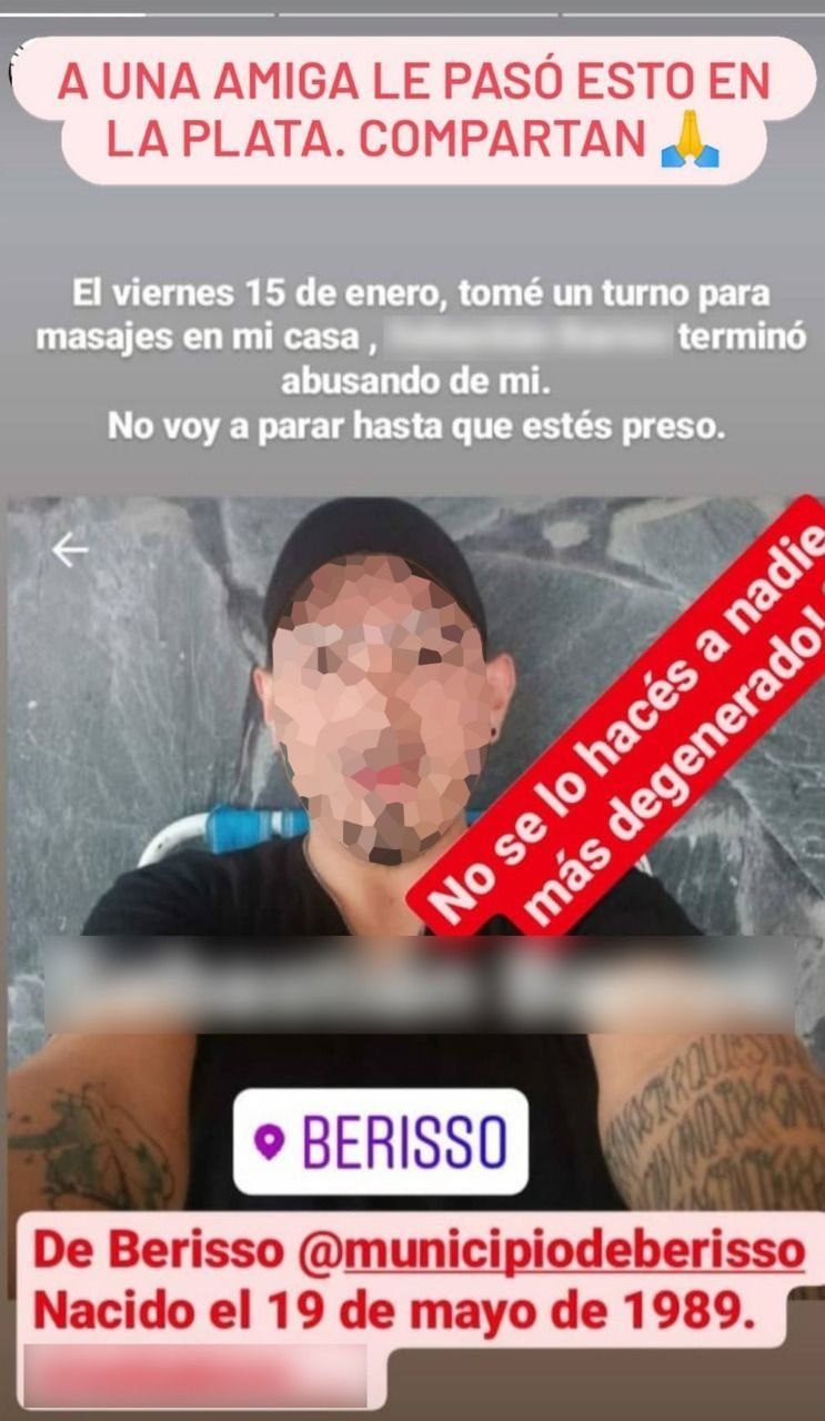 Una mujer de 37 años denunció que un masajista la abusó sexualmente en una vivienda ubicada en 43 entre 19 y 20. Tras el ataque, el hombre le envió un mensaje de WhatsApp en el cual reconoció los hechos y le pidió disculpas. El acusado tiene varias denuncias por violencia de género.