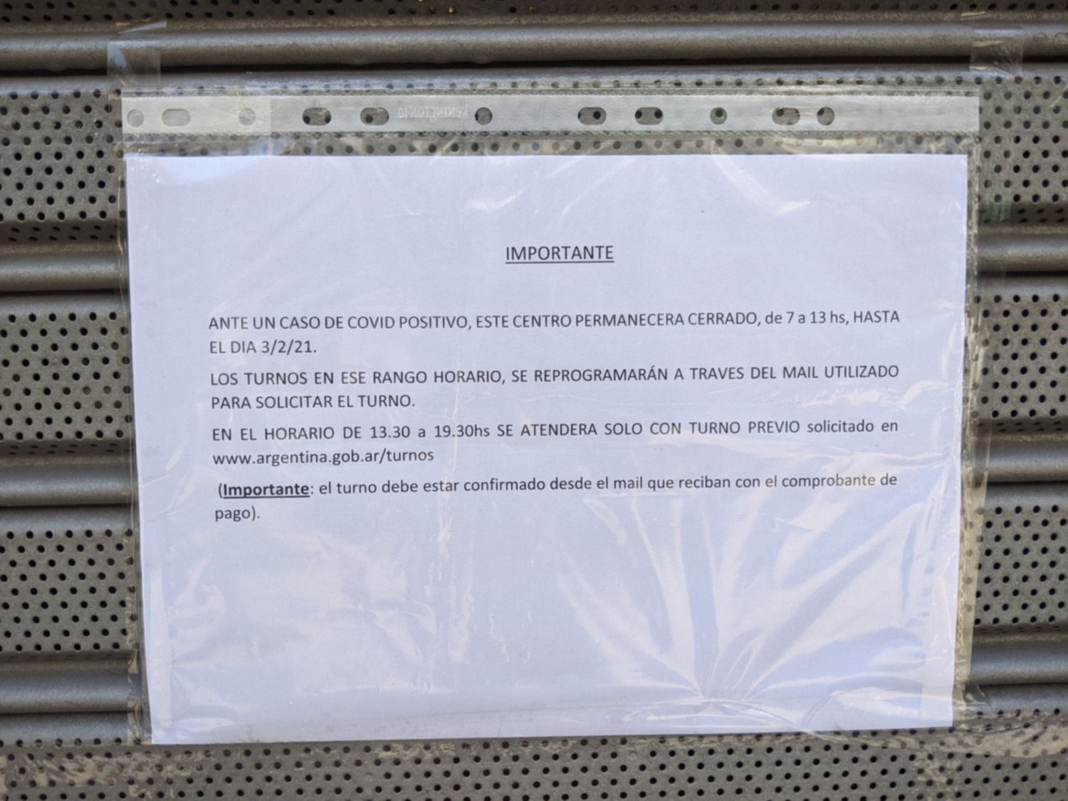 "Ante un caso de COVID positivo, este centro permanecerá cerrado, de 7 a 13 hs., hasta el día 3/2/21", reza el pequeño cartel pegado en la puertas de las oficinas ubicadas en 7 entre 54 y 55.