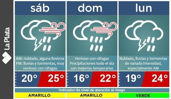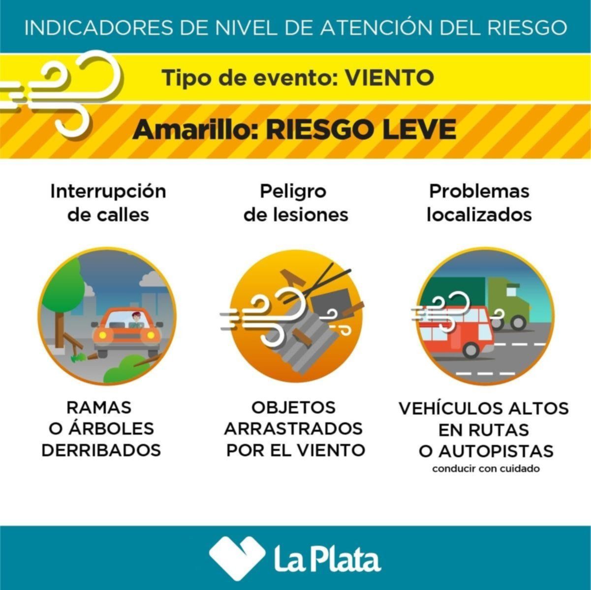 La Municipalidad de La Plata decidió elevó de forma preventiva el Nivel de Atención del Riesgo a "Amarillo" a causa del "tiempo ventoso con ráfagas" que está pronosticado desde la tarde del próximo sábado y hasta el próximo domingo. Los especialistas de la Dirección de Hidrometerología se anticiparon para poner en alerta a los vecinos y advertirles que tomen los recaudos necesarios para evitar incidentes.
