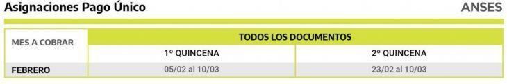 En tanto, el viernes 29 de enero comenzó el cobro de la Tarjeta Alimentar para los beneficiarios que cuentan con la tarjeta física. En el caso de los beneficiarios de Asignación Universal por Hijo (AUH) o Asignación Universal por Embarazo (AUE) de ANSES que no tienen el plástico cobrarán el monto total del beneficio en la cuenta bancaria en la que habitualmente perciben la asignación, según el calendario de pago anunciado.