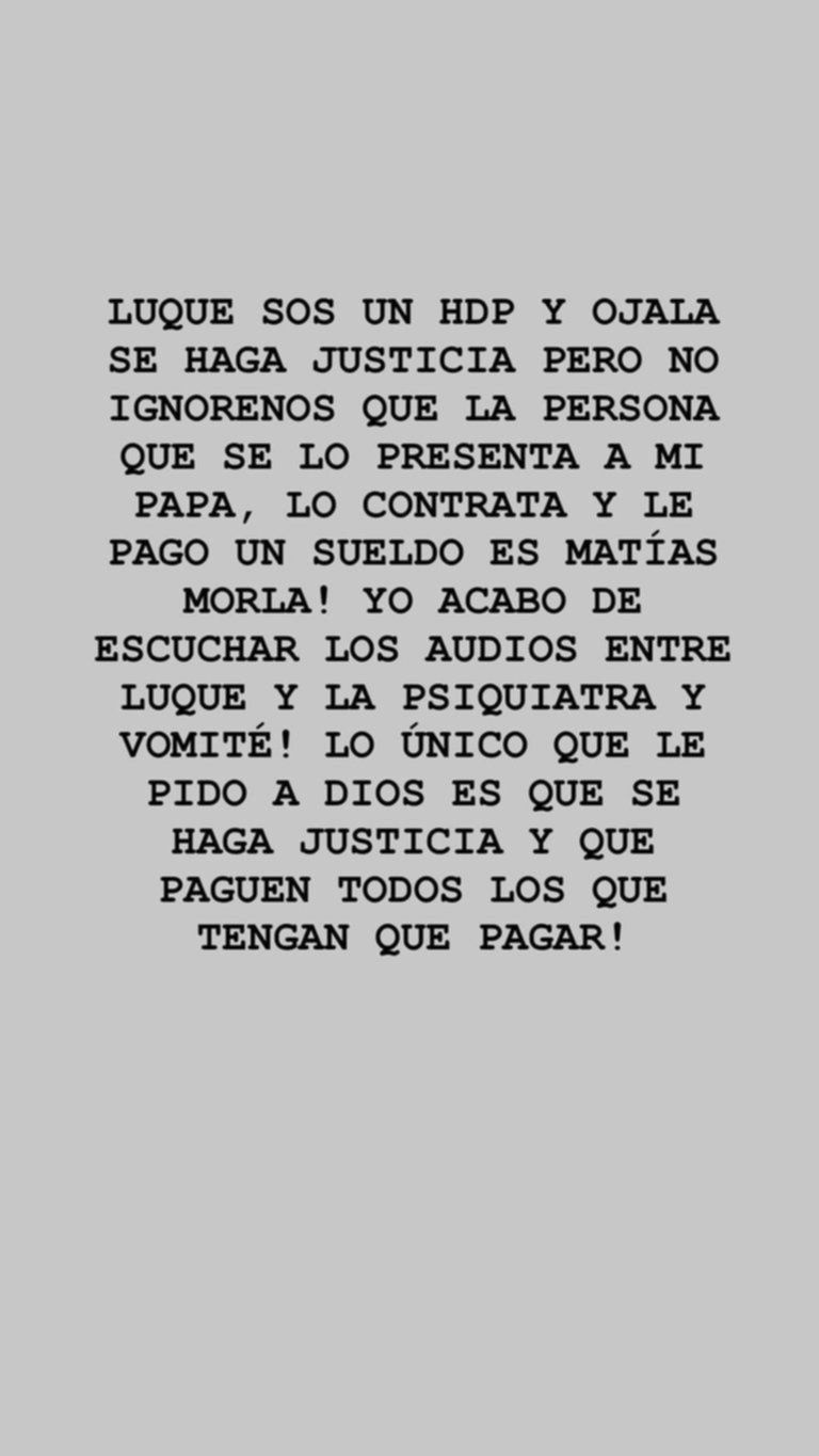 “Luque, sos un hdp y ojalá se haga justicia”, fue lo primero que escribió la actriz en su cuenta de Instagram. “Pero no ignoremos que la persona que se lo presenta a mi papá, lo contrata y le pagó un sueldo es Matías Morla”, enfatizó reforzando la guerra mediática y judicial que mantiene con quien fuera el abogado y apoderado de su padre.
