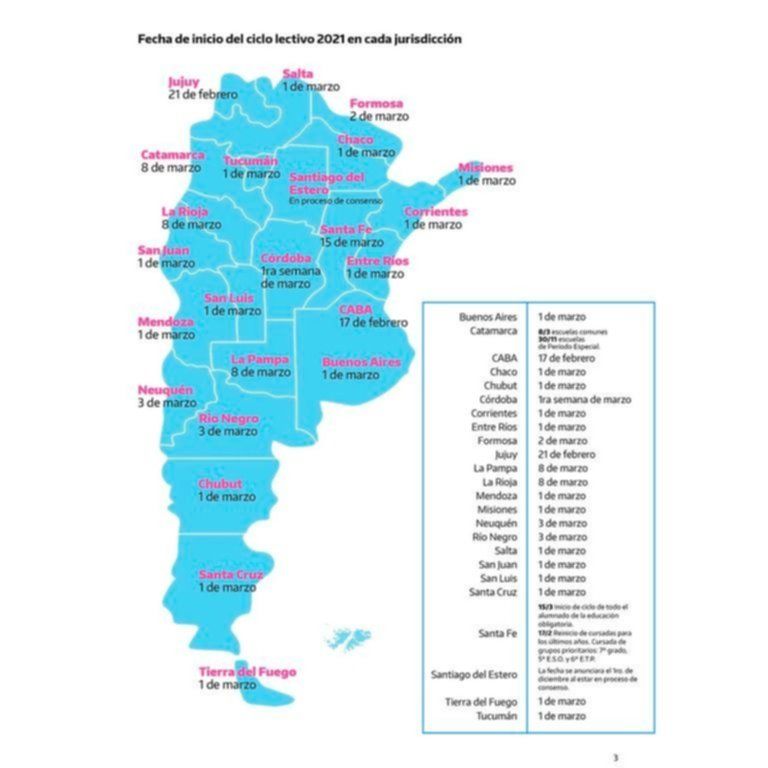 Por su parte, la Ciudad de Buenos Aires se desmarcará del resto del país y retomará el ciclo lectivo el miércoles 17 de febrero, con la idea de compensar los contenidos perdidos durante la pandemia. Algunos días después, el lunes 22, será el puntapié en Jujuy. En 19 distritos las clases comenzarán en la primera semana de marzo, en La Rioja y La Pampa empezarán en la segunda, mientras que en Santa Fe recién en la tercera.