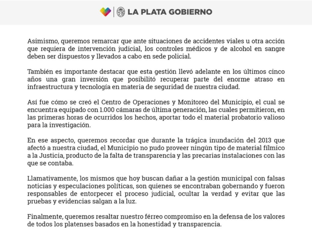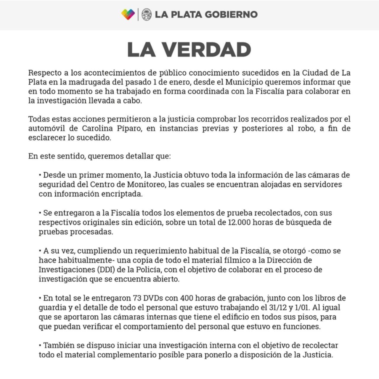 "Respecto a los acontecimientos de público conocimiento sucedidos en la ciudad de La Plata en la madrugada del pasado 1° de enero, desde el Municipio queremos informar que en todo momento se ha trabajado en forma coordinada con la Fiscalía para colaborar en la investigación llevada a cabo", indicaron las autoridades locales en el comunicado difundido en las últimas horas. Es la primera vez que el Municipio realiza una declaración pública respecto del caso que desató un fuerte escándalo en la ciudad y en ese marco indicaron además que "todas estas acciones permitieron a la Justicia comprobar los recorridos realizados por el automóvil de Carolina Piparo, en instancias previas y posteriores al robo, a fin de esclarecer lo sucedido".