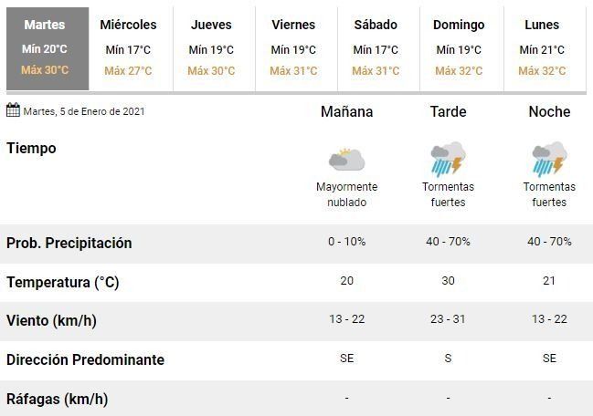 De acuerdo con las previsiones de los expertos, el día transcurrirá con un cielo mayormente nublado una temperatura de entre 20 y 30°C y "tormentas fuertes" hacia las últimas horas de la jornada.