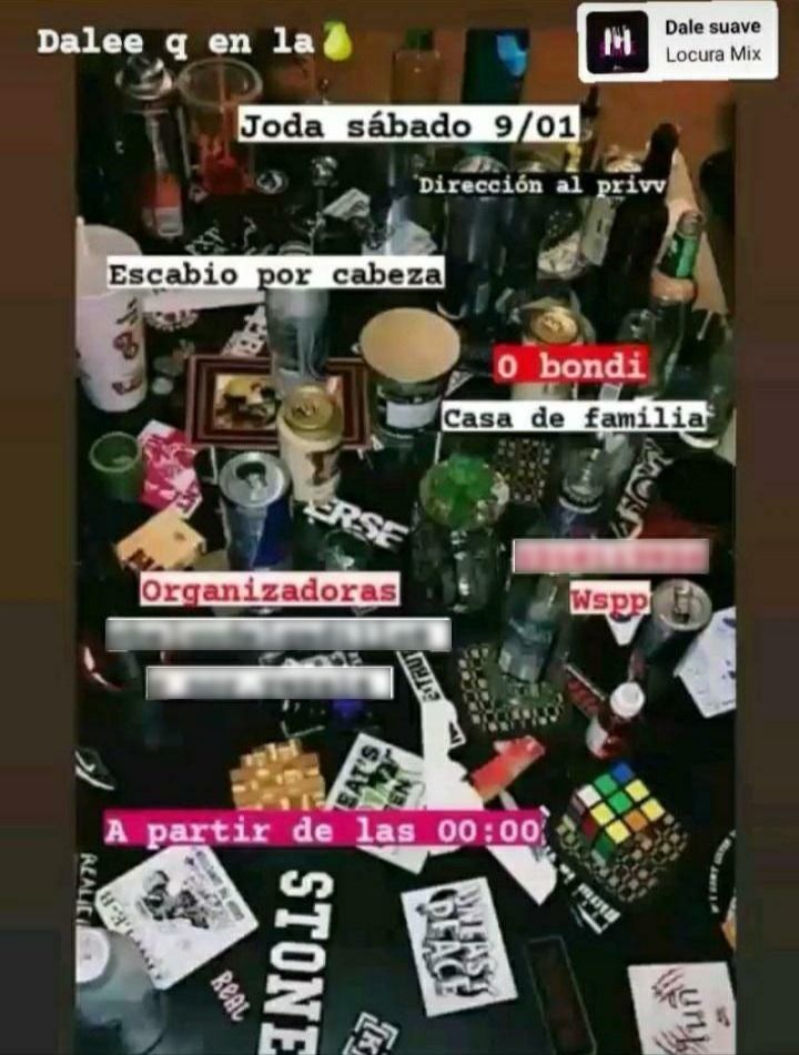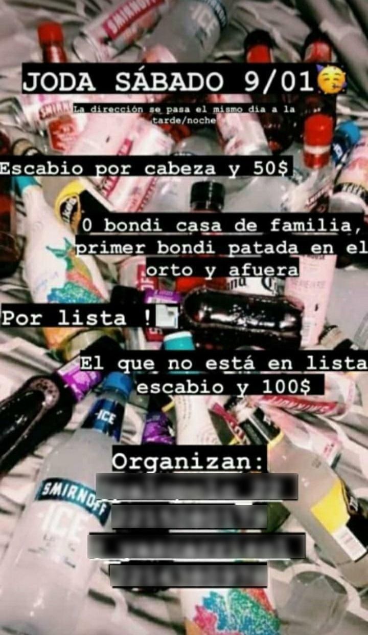 "Joda sábado 9/01. Escabio por cabeza y $50. 0 bondi casa de familia, primer bondi patada y afuera", reza una de las capturas de pantalla de stories de Instagram y las conversaciones de WhatsApp que compartieron varios lectores de 0221.com.ar para dar cuenta de las fiestas clandestinas que se organizan en la ciudad para los próximos días.