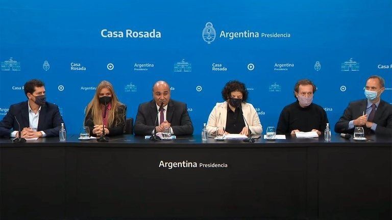 De la conferencia de prensa participaron el jefe de Gabinete, Juan Manzur, los ministros de Salud, Carla Vizzotti, y de Interior, Eduardo Wado de Pedro, el secretario de Asuntos Estratégicos, Gustavo Béliz, y el representante del Banco Mundial en el país, Jordan Schwartz.
