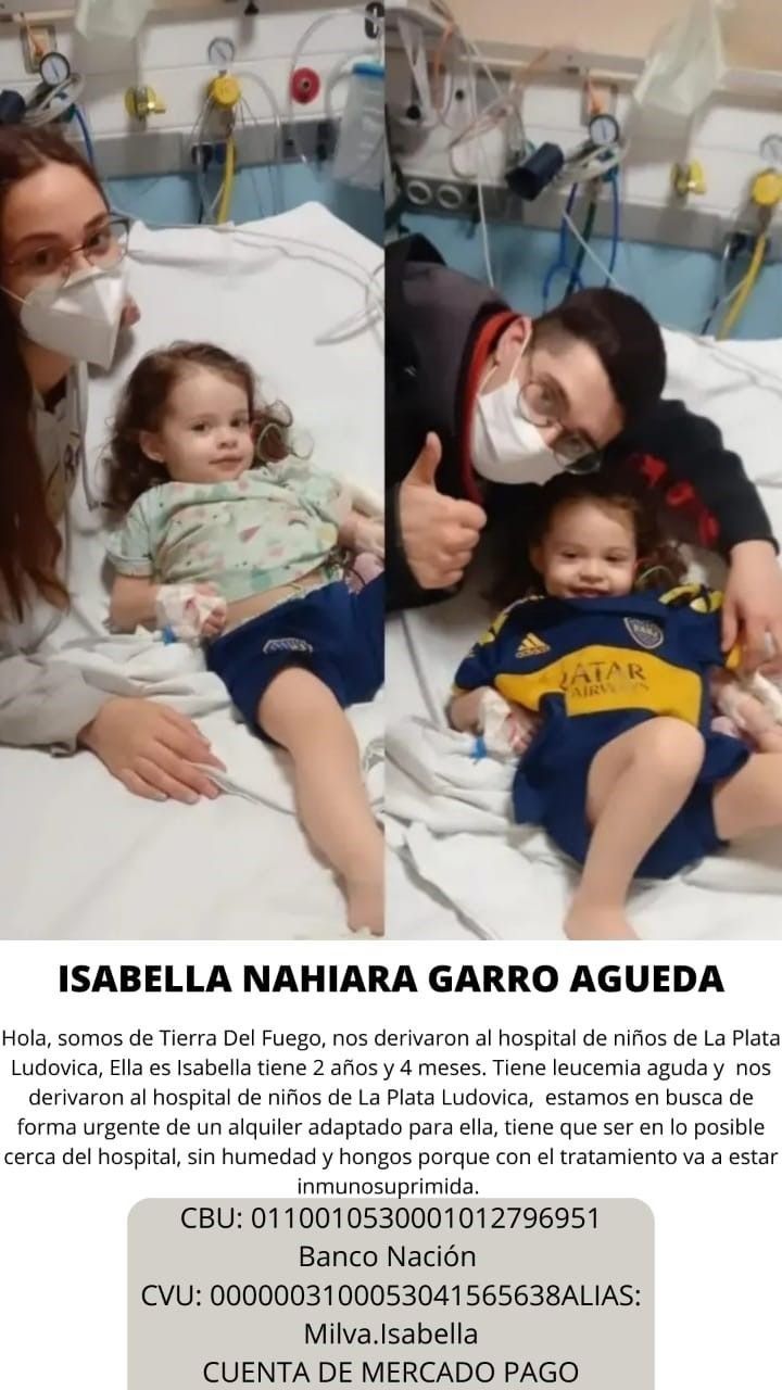 Según indicó, la menor afrontará la quimioterapia desde el jueves y deberá estar durante meses en una burbuja sanitaria ya que tendrá las defensas bajas: “Somos de Tierra Del Fuego, nos derivaron al hospital de niños de La Plata Ludovica, ella es Isabella y tiene leucemia aguda y estamos en busca de forma urgente de un alquiler adaptado para ella, tiene que ser en lo posible cerca del hospital, sin humedad, polvillo y hongos porque con el tratamiento va a estar inmunosuprimida y se tiene que cuidar mucho, cualquier cosa es peligrosa para ella”.