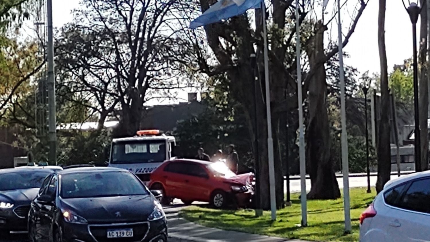 Un auto marca Volkswagen Gol de color rojo pasó de largo mientras circulaba por la rotonda de 120 y 32 y terminó incrustado contra un árbol.