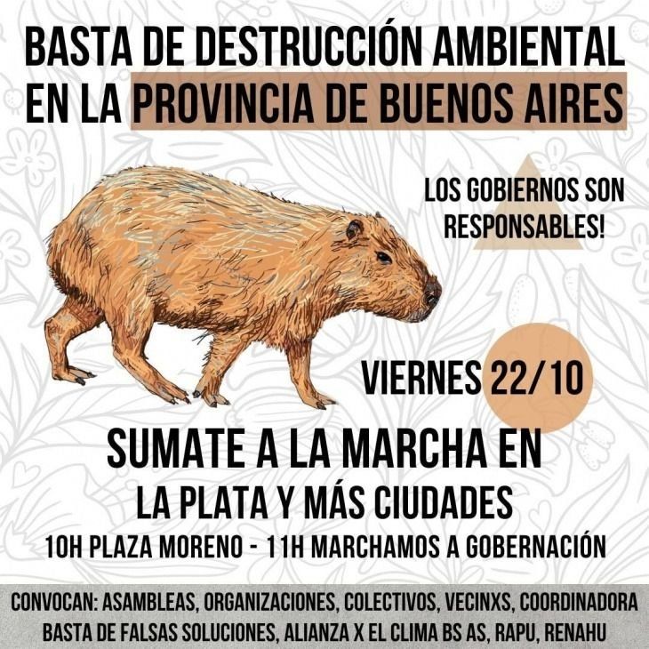 El reclamo se llevará adelante bajo el lema “Basta de destrucción ambiental en la Provincia de Buenos Aires, los gobiernos son responsables" y llevará la imagen del carpincho como símbolo principal. En ese sentido, explicaron que el animal fue elegido como referencia debido a que es una de las especies autóctonas que vio más reducida su hábitat natural ante los grandes negocios inmobiliarios y los avances de la frontera agropecuaria en el territorio bonaerense.