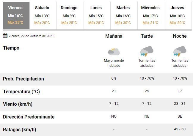 Hacia el cierre de este último día de la semana se esperan tormentas aisladas en toda la región, con vientos soplando desde el noreste y sudeste y hasta ráfagas de viento de entre 42 y 50 kilómetros por hora.