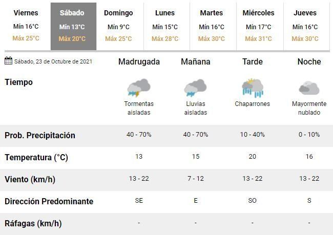 El mal tiempo se extenderá además hasta el sábado, para cuando se prevén más lluvias y tormentas y chaparrones aislados, mejorando hacia la tarde noche. Los expertos prevén, en esa línea, un fuerte descenso de la temperatura y anticipan una mínima de 13°C para el primero de los días de descanso y 9°C para el próximo domingo.