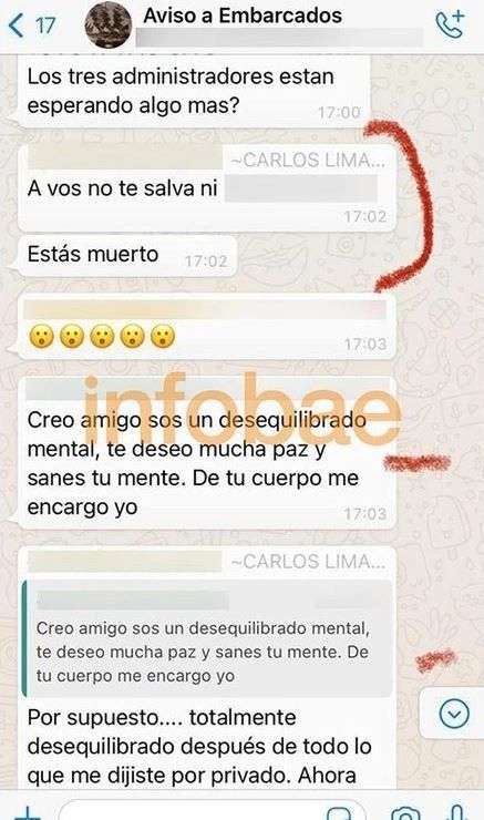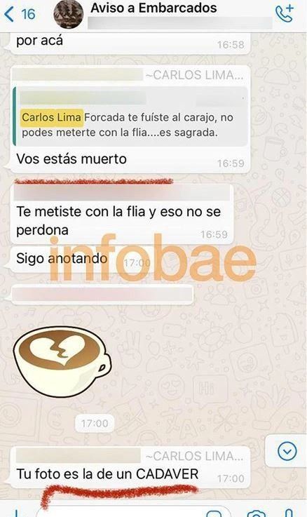 El análisis del teléfono de Carlos Eugenio Lima, confeso homicida de dos de sus compañeros de tripulación en un barco amarrado en Punta Lara, arrojó un dato que puede resultar clave para establecer el móvil de los asesinatos. En un chat de antigua data amenazó a uno de sus compañeros y le escribió "vos estás muerto", pero incluso fue más allá y en medio del grupo de WhatsApp le lanzó "tu foto es la de un cadáver", cuando uno de sus colegas lo increpó: "Te metiste con la flia y eso no se perdona".