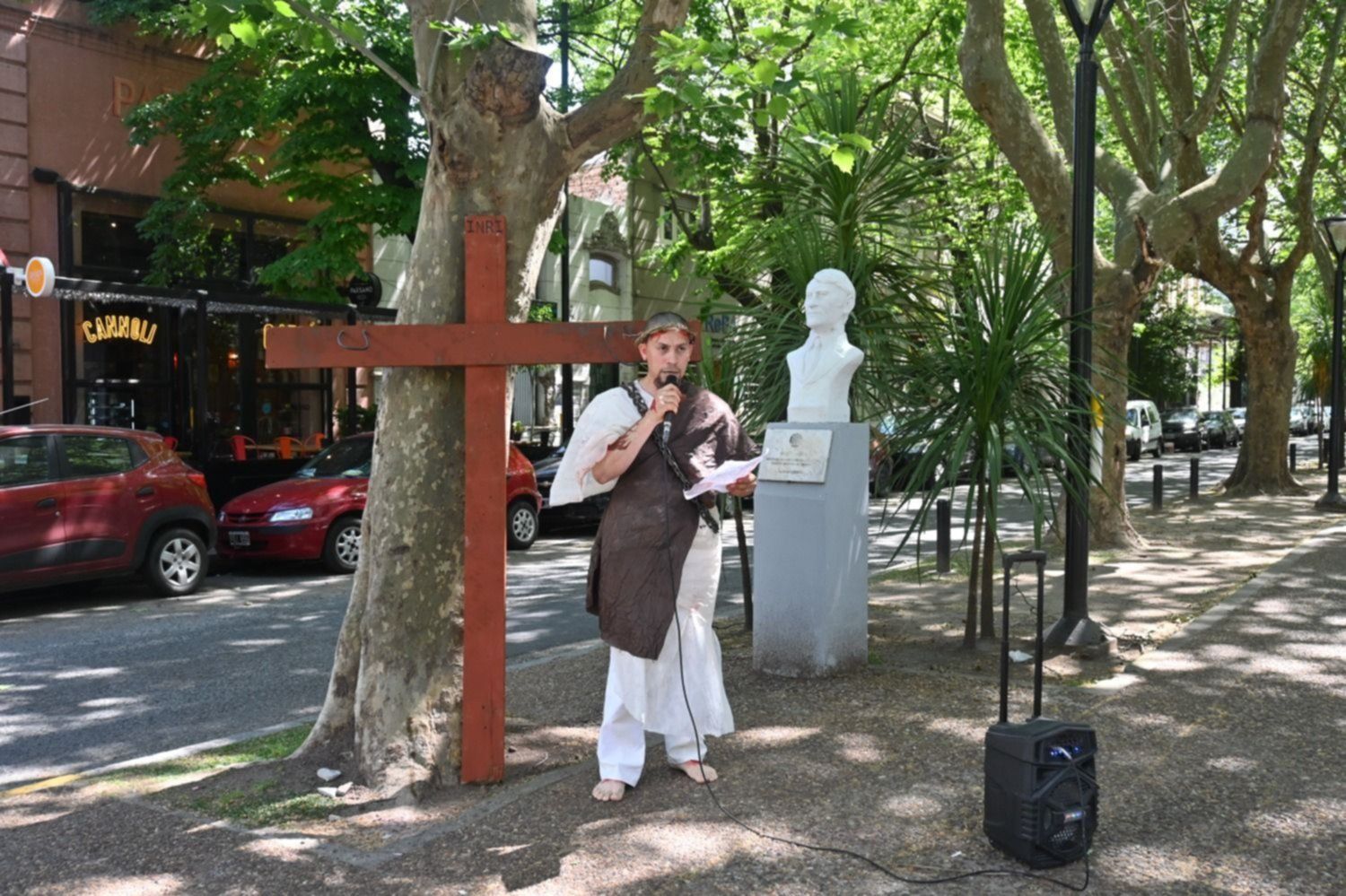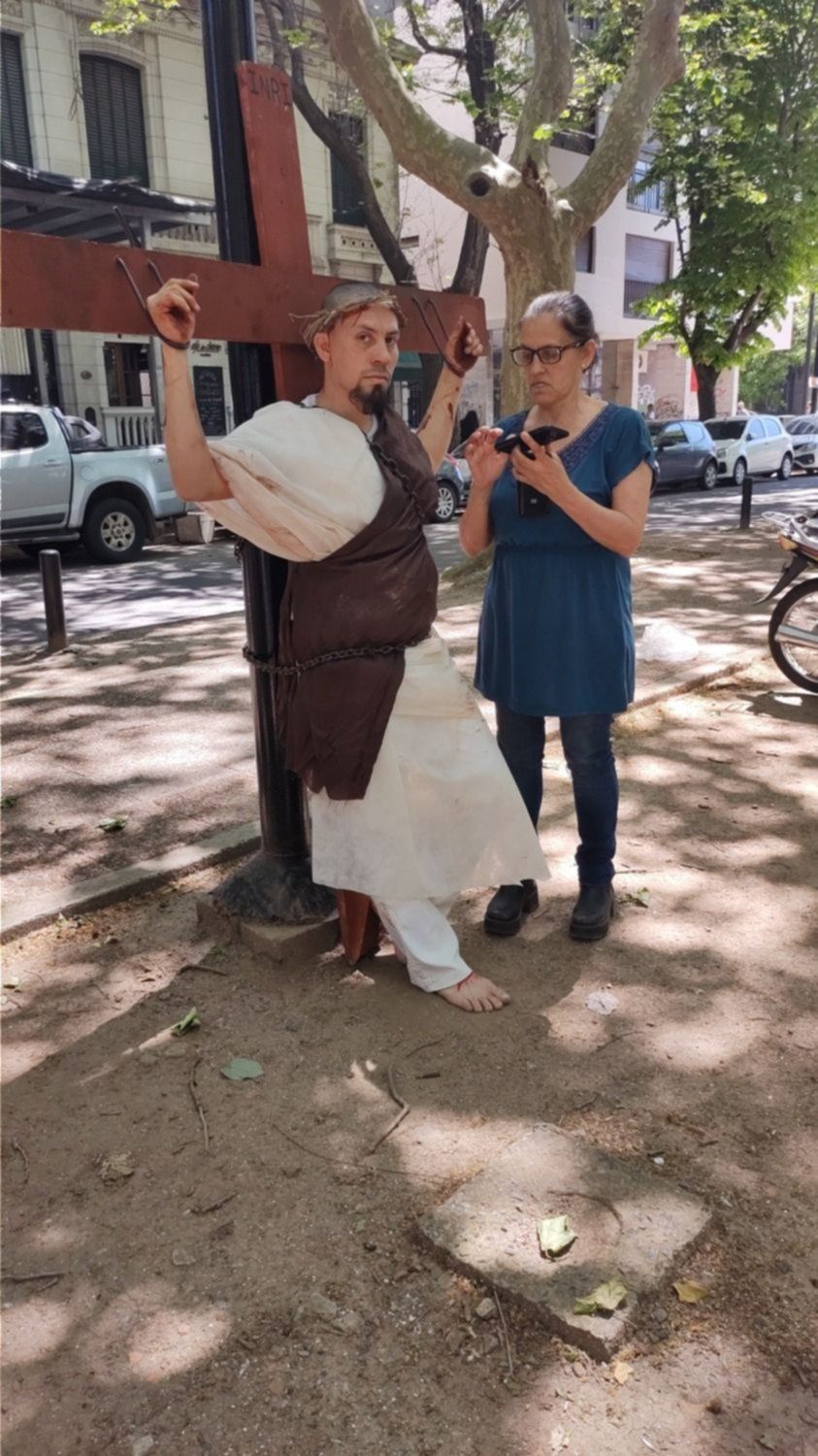 Este miércoles se vivió una insólita situación en La Plata cuando un hombre “se crucificó” en pleno centro para defender a su mujer policía y a la religión cristiana. Disfrazado de Cristo con una gran cruz y hasta un líquido rojo que simulaba ser sangre chorreando por su cuerpo, un platense caminó por la ciudad, llamó la atención de los transeúntes y simuló su crucifixión frente al Ministerio de Seguridad para sumarse al reclamo de los efectivos, así como también apoyar las creencias del cristianismo.