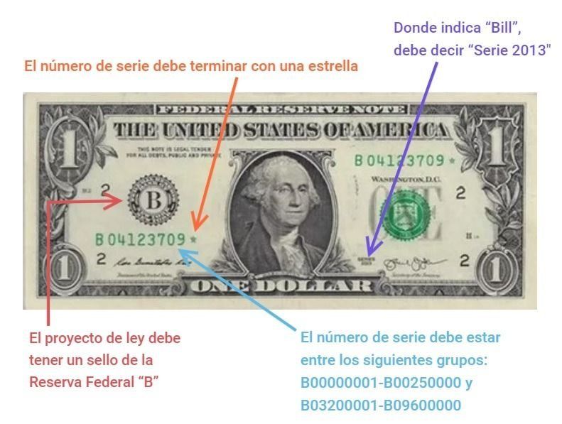 Para ser válidos los billetes tienen que haber sido emitidos por la Reserva Federal de Nueva York, en su serie correspondiente a 2013. Su identificación debe encontrarse entre los números de serie B00000001 y B00250000, o bien entre los números de serie B03200001 y B09600000. Además, el billete debe contener un sello de la Reserva Federal con la letra "B". Y el número de serie debe terminar con la imagen de una estrella.