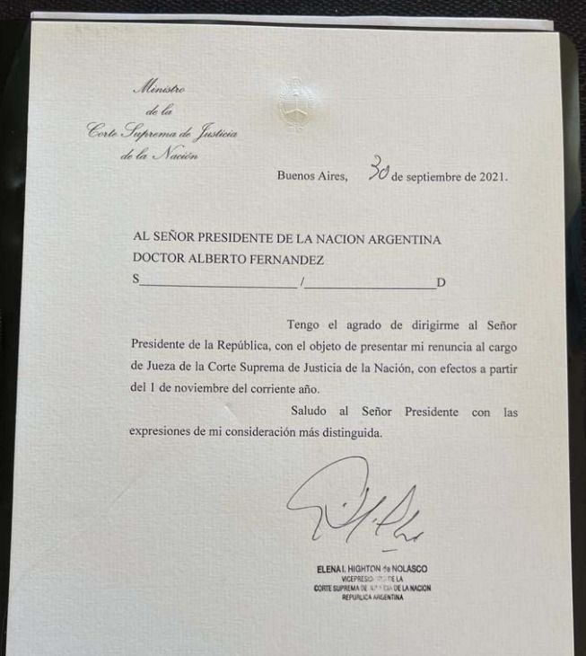 La jueza Elena Highton de Nolasco presentó su renuncia a la Corte Suprema de Justicia que se hará efectiva a partir del 1° de noviembre. Con una carta fechada el 30 de septiembre pasado, la magistrada envió al Presidente de la Nación su texto de dimisión.