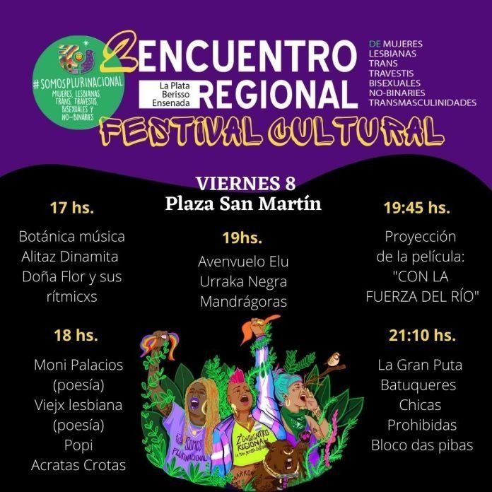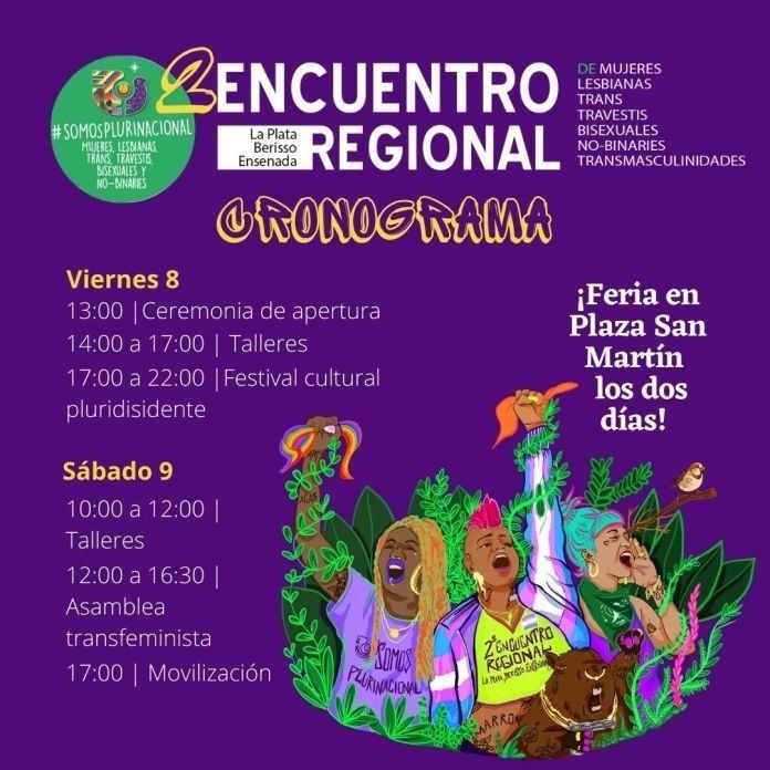 En el caso local se trata del Segundo Encuentro Plurinacional de mujeres, lesbianas, travestis, trans, bisexuales, personas no binaries y transmasculinidades de La Plata, Berisso y Ensenada que se realizará en Plaza San Martín. Serán dos días de debates transfeministas y plurinacionales al aire libre con festival cultural, feria autogestiva, asamblea abierta y una marcha por la ciudad.