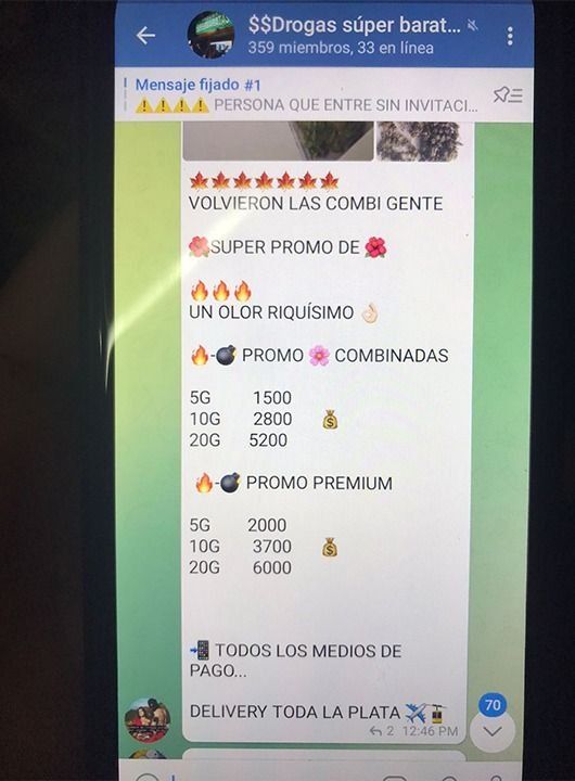 A la cabeza de la organización, se cree, estaba Duvier Humberto Ortiz Vallejo, de 25 años, nacido en Colombia y con DNI argentino, sin ningún empleo registrado en su historia en el país y quien manejaba su ilegal comercio desde su teléfono. Había concentrado todo en un grupo de Telegram conocido como "Drogas súper baratas", con 359 miembros atentos a sus packs y promociones.