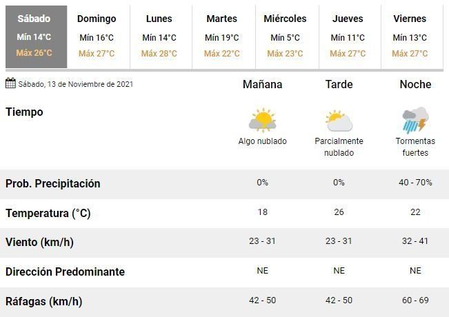 Los expertos de la Dirección de Hidrometeorología de la Comuna anticiparon un sábado "ventoso con ráfagas entre 40 y 50 Km/h" y agregaron que "hacia la noche aumenta la chance de tormentas", algunas de las cuales podrían ser "fuertes y con ráfagas".